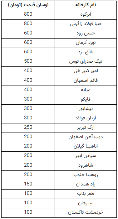 طبق جدول فوق بیشتر رشد مربوط به کارخانه ابرکوه و صبا فولاد زاگرس است. این دو کارخانه با رشد ۸۰۰ تومانی قیمت میلگرد، بالاترین نوسانی قیمتی در بخش میلگرد را به خود اختصاص دادند.