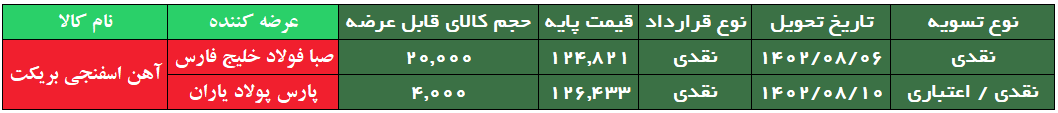 اما از کل محصول بریکت اسفنجی امروز، ۴ هزار تن متعلق به شرکت پارس پولاد یاران است که نیمی از آن نقدی و نیمی اعتباری تسویه خواهد شد. نرخ پایه تعیین شده برای این محصول نیز ۱۲ هزار و ۶۴۳ تومان است.