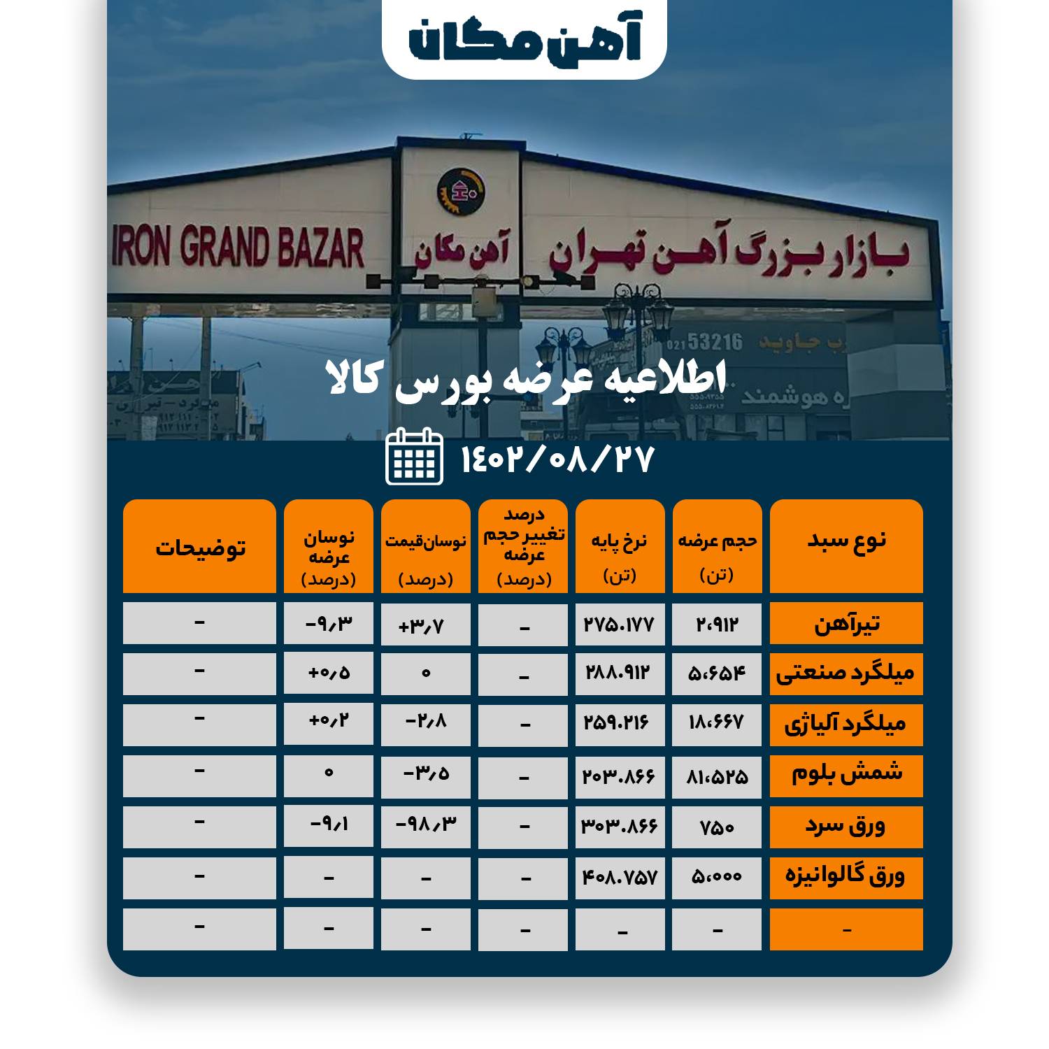 امروز ۲۷ آبان ۱۴۰۲، یک میلیون و ۵۰۰ هزار و ۳۰۸ تن محصول شامل ۱۱۴ هزار و ۵۰۸ تن محصولات نورد فولادی، یک میلیون و ۲۸۳ هزار و ۸۰۰ تن محصولات سنگ آهنی و ۱۰۲ هزار تن آهن اسفنجی در تالار صنعتی عرضه می‌شود.